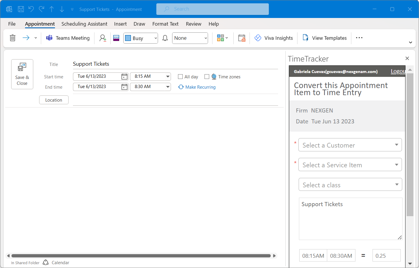 To use the Time Tracker Add-In, first add the application to your Outlook. Then open a calendar event and follow the steps below.