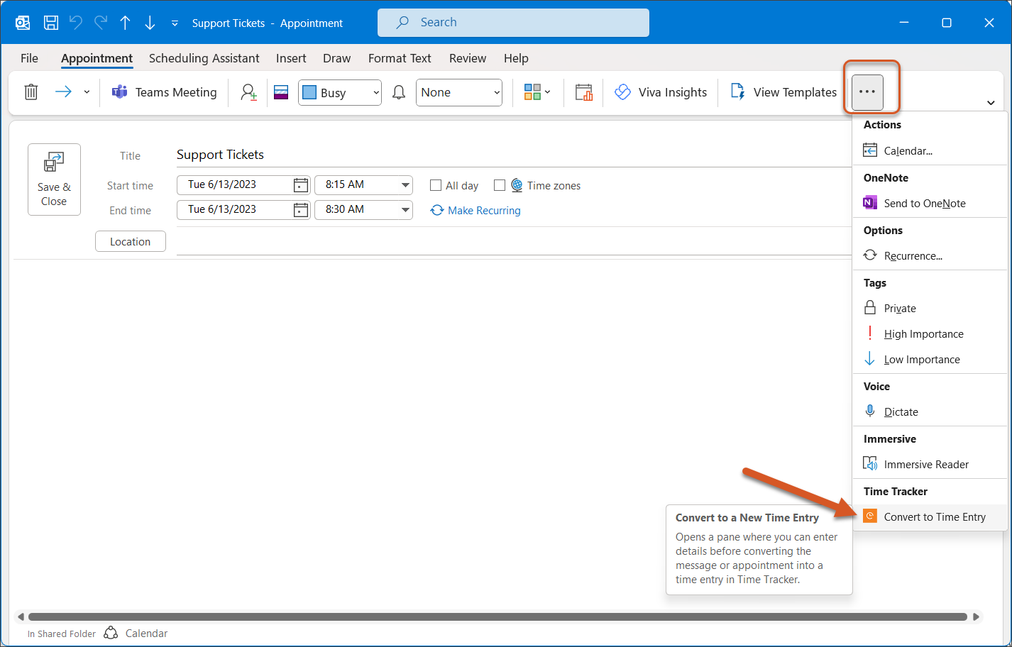 - From the calendar event you want to track, click the 3 dots on the top right and select the Time Tracker option. Your option may say "Convert to Time Entry".