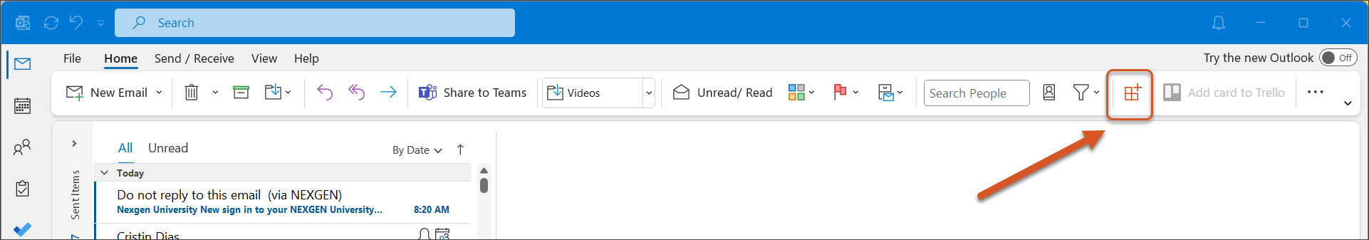- Click into your mailbox tab and find the Add-Ins icon. Click on the icon. You may have to click the 3 dots on the far right to see additional toolbar options.